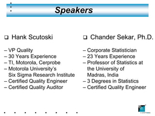 Hank Scutoski and Chander Sekar presented at the Southwest Test Conference on Gage R&R studies. They discussed how Gage R&R studies are important to understand measurement system capability before comparing or controlling manufacturing processes. The presentation covered key topics like repeatability, reproducibility, sources of variation, how to perform Gage R&R studies, and ways to analyze the data including calculating precision-to-tolerance ratios. The goal is to use statistical tools and Gage R&R results to improve processes and ensure consistent high quality products.