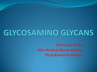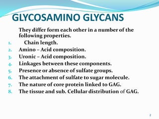 This document discusses glycosaminoglycans (GAGs), which are heteropolysaccharides composed of long chains of disaccharide units. It describes 8 properties that can differ between GAGs, including chain length, amino acid and uronic acid composition, and sulfate group attachment. The document then lists 9 functions of GAGs in the extracellular matrix and tissues, such as structural support, selective permeability, and shock absorption. Finally, it classifies and describes the characteristics and functions of 6 major GAGs: chondroitin sulfate, hyaluronic acid, dermatan sulfate, heparin, heparan sulfate, and keratan sulfate.