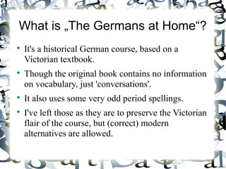 This document introduces "The Germans at Home", a historical German course based on a Victorian textbook. It uses conversations to tell the story of a typical German family, the Baumanns, and their daily life. While it teaches basic German vocabulary and grammar, the outdated content means it doesn't reflect modern German. However, it provides an intriguing glimpse into 19th century life. The course introduces the Baumann family members and their servants that the student will learn about through the first 10 conversations between Wilhelm and his nanny preparing for breakfast.
