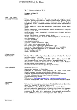 Gail Gibson has dual British/South African citizenship and has obtained numerous qualifications ranging from financial planning and assessment to nutrition, massage therapy, and ethnomedicine. She has over 30 years of experience in training, financial services, business ownership, and volunteer work. Her most recent role was as Group Compliance Manager at Discovery, where she designed regulatory training programs. She now owns Naked Mindz, providing training services to insurance and education companies.