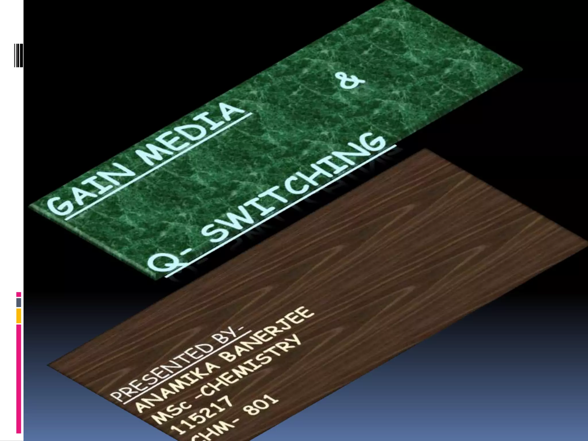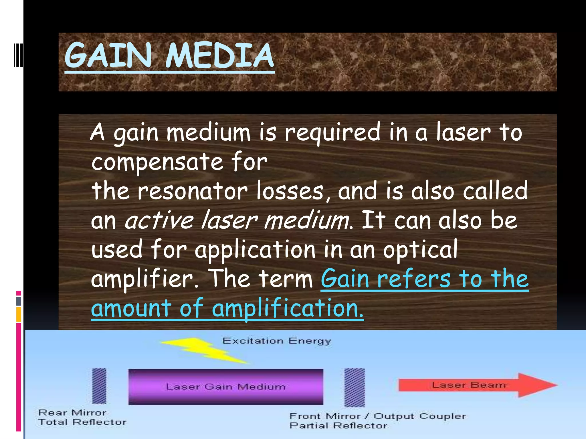 There are three main types of laser gain media: gases, liquids, and solids. Gases like CO2 have narrow wavelength gain, while liquids like dyes have broad gain. Solid state lasers like Nd:YAG can have either narrow or broad gain depending on the material. All gain media require pumping to receive energy, which can be optical pumping using lamps or flashlights, or electrical pumping using gas discharges. Q-switching is a technique to produce high power pulses using a Pockels cell to prevent lasing until a population inversion is fully inverted.