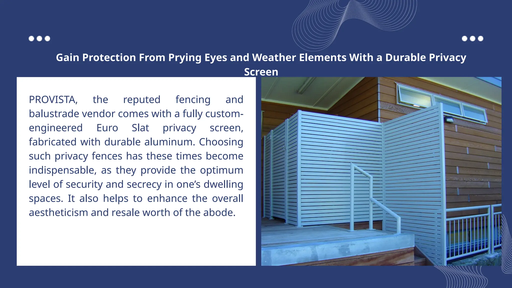 PROVISTA brings a custom-designed, durable, lightweight, and simple-to-install EURO Slat privacy screen fencing system that can be easily restored in no time.
