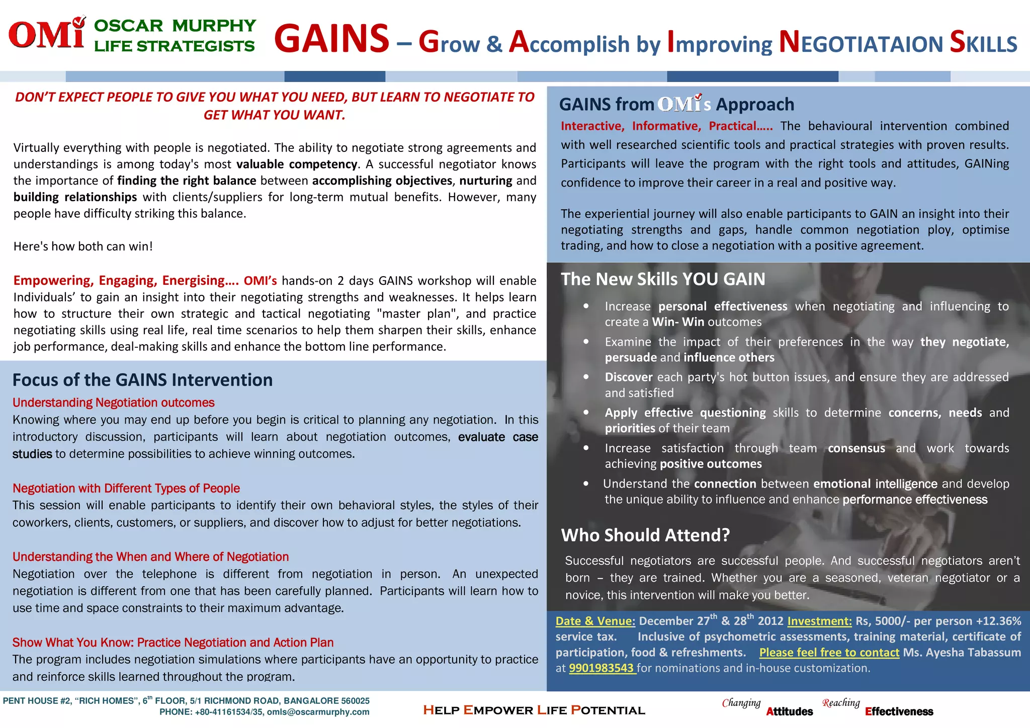 This document provides information about a 2-day negotiation skills workshop called GAINS hosted by Oscar Murphy Life Strategists. The workshop aims to help participants gain negotiation skills and insights into their strengths and weaknesses. It will cover understanding different negotiation outcomes, styles, contexts and include practice simulations. Attendees will learn techniques like identifying priorities, addressing concerns, and influencing others to achieve win-win agreements. The workshop dates are December 27-28, 2012 in Bangalore, India with a cost of Rs. 5000 per person plus taxes.