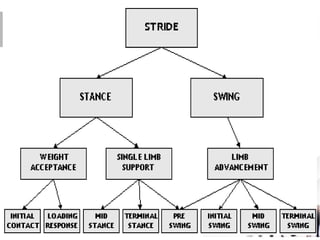 This document discusses gait cycle and pathological gait. It begins by defining gait cycle and describing the normal phases of gait including stance and swing phases. It then covers topics like neurological control of gait, kinematics, determinants of gait, muscle activity, kinetics, and age-related changes to gait. The document concludes by describing several types of pathological gait that can result from muscle weakness, structural deformities, or neurological disorders such as limping, lurching, Trendelenburg gait, and hemiplegic gait.