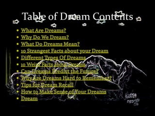 Dreams occur during sleep and can involve stories, images, emotions, and thoughts. Studies have shown dreams are important for health and well-being. Experts have various theories for why we dream, such as to solve problems, process memories and emotions, or reflect unconscious thoughts and feelings. Different types of dreams include normal dreams, daydreams, nightmares, progressive dreams, recurring dreams, lucid dreams, false awakenings, healing dreams, prophetic dreams, signal dreams, epic dreams, and mutual dreams. Tips are provided for improving dream recall and interpretation. However, the exact purpose and meaning of dreams remains unclear.