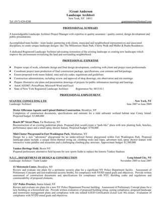Grant Anderson is a landscape architect with over 20 years of experience in design, project management, and construction administration. He has expertise in urban park and public space design, and has managed projects ranging from $400,000 to $3,800,000. His experience includes work for the NYC Department of Parks and various private landscape architecture firms.