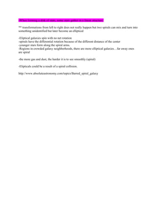 Galaxies can have different morphologies including elliptical, spiral, and irregular shapes. Elliptical galaxies have a spherical bulge of stars with no discernible disk structure, while spiral galaxies contain a central bulge and disks with spiral arms containing younger stars. Spiral galaxies are further classified based on characteristics of their bulge and spiral arm structure. The Hubble sequence arranges galaxies from elliptical to spiral shapes based on their morphology, with elliptical galaxies generally containing older stellar populations. Interactions between galaxies can transform their shapes over time.