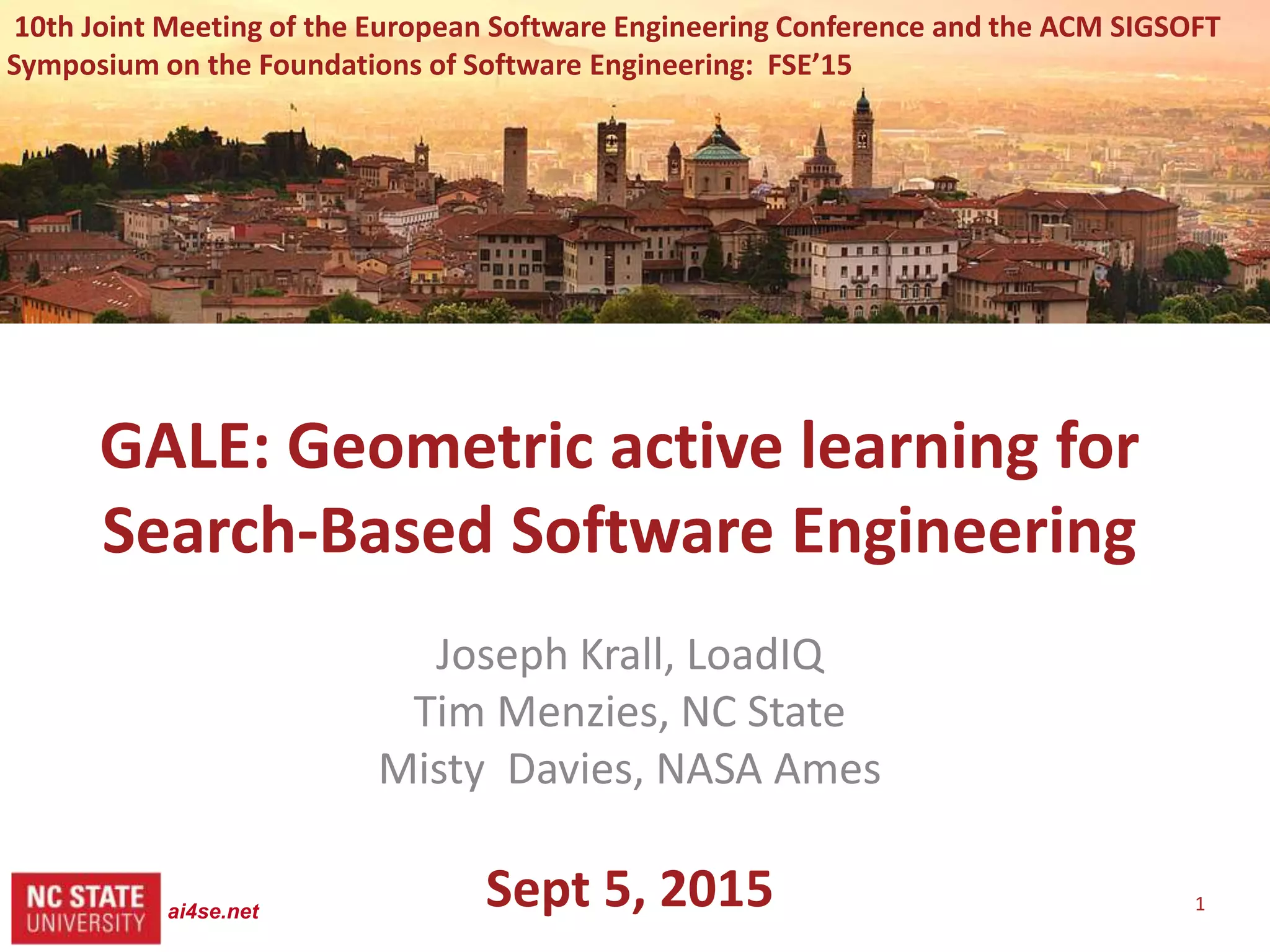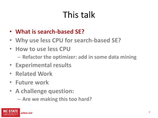 The document discusses geometric active learning within search-based software engineering (SBSE), focusing on the importance of reducing CPU usage for better efficiency. It highlights methods such as optimizer refactoring and employing data mining techniques to lessen computational demands while assessing a large number of candidate solutions. The presentation also outlines experimental results, related work, and future research avenues, emphasizing the potential to simplify complex problems in software engineering.