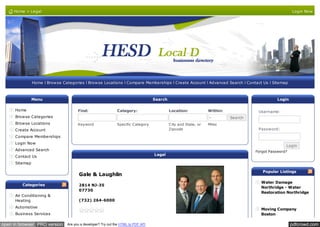 The document provides a directory of various services, primarily focused on legal services and home improvement categories such as water damage restoration and moving services. It lists contact details for specific businesses, including their address and phone number. Additionally, it features statistics on category hits and mentions popular listings for different services.