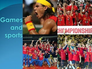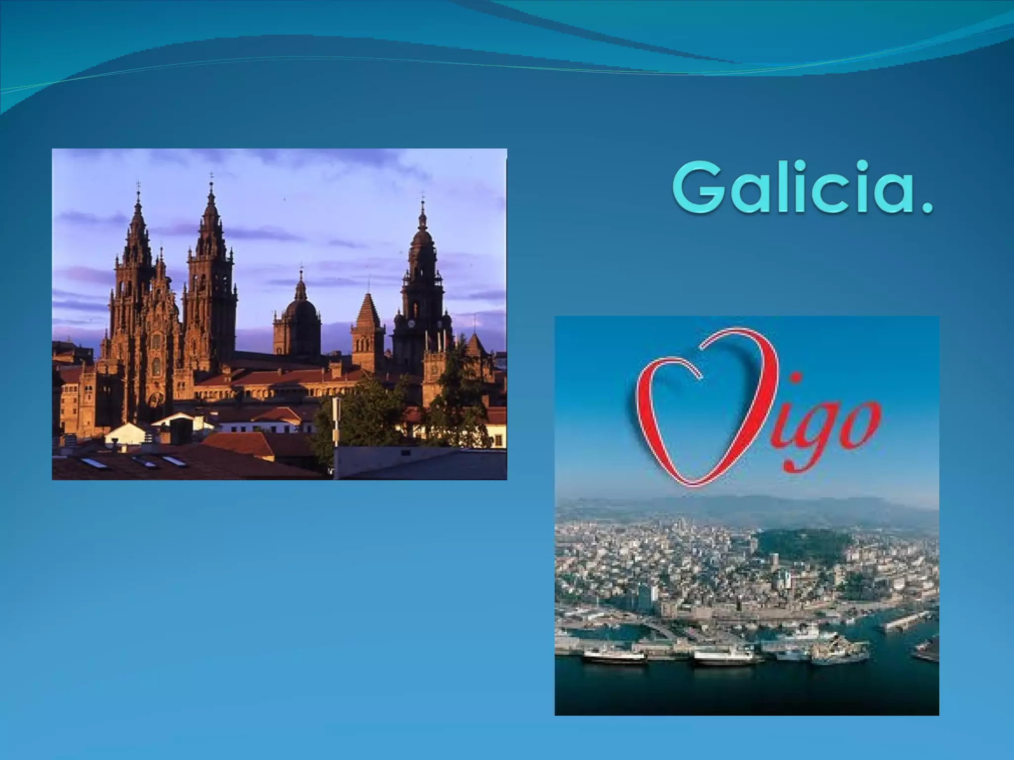 Galicia is located in northwestern Spain and Vigo is located in southwestern Galicia. The document discusses Vigo's flag, traditional games like futbolin, the Cíes Islands off Vigo's coast known for their beaches, typical Spanish and Galician foods like paella and octopus, and desserts. It also describes monuments in Vigo including El Sireno, the first European sculpture made of stainless steel, and El Nadador showing the torso of a swimmer. The anthem of Galicia is called "Os Pinos" with lyrics by Eduardo Pondal and music by Pascual Veiga.
