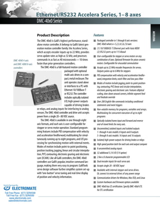 The Accelera DMC-40x0 is Galil's highest performance multi-axis motion controller, accepting encoder inputs up to 22 MHz and processing commands in as fast as 40 microseconds. It is available in 1 to 8 axis models and is configurable for stepper or servo motors. Standard features include PID control, I/O processing, and multi-axis coordinated motion capabilities like linear interpolation. The DMC-40x0 is designed for demanding motion control applications.