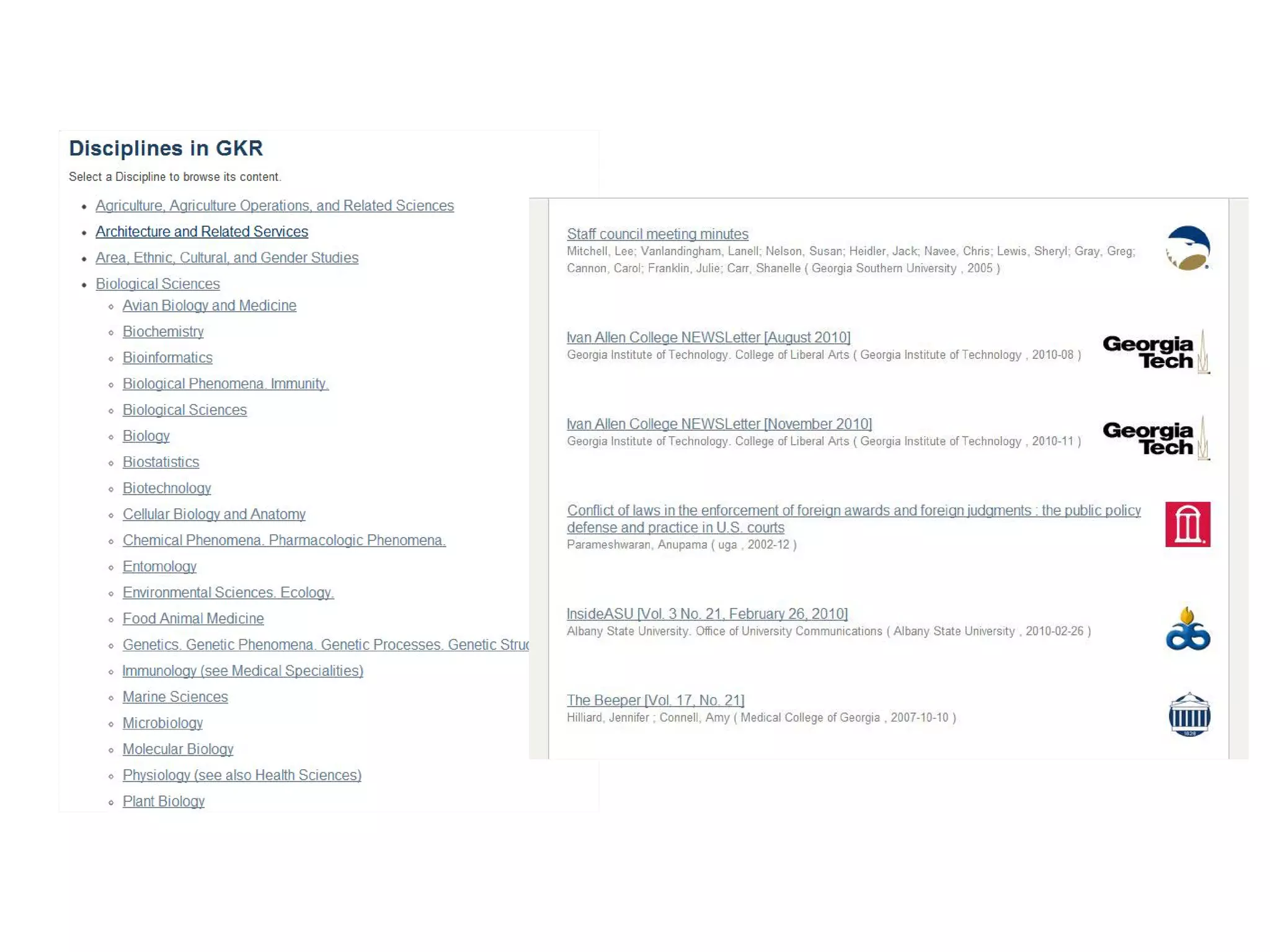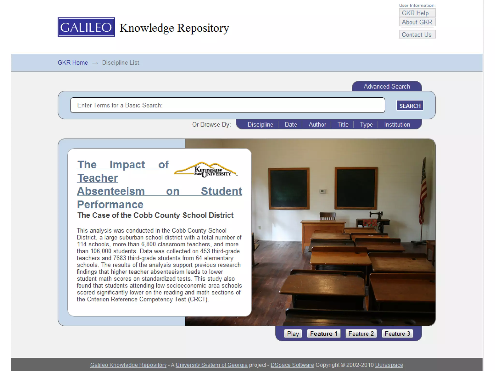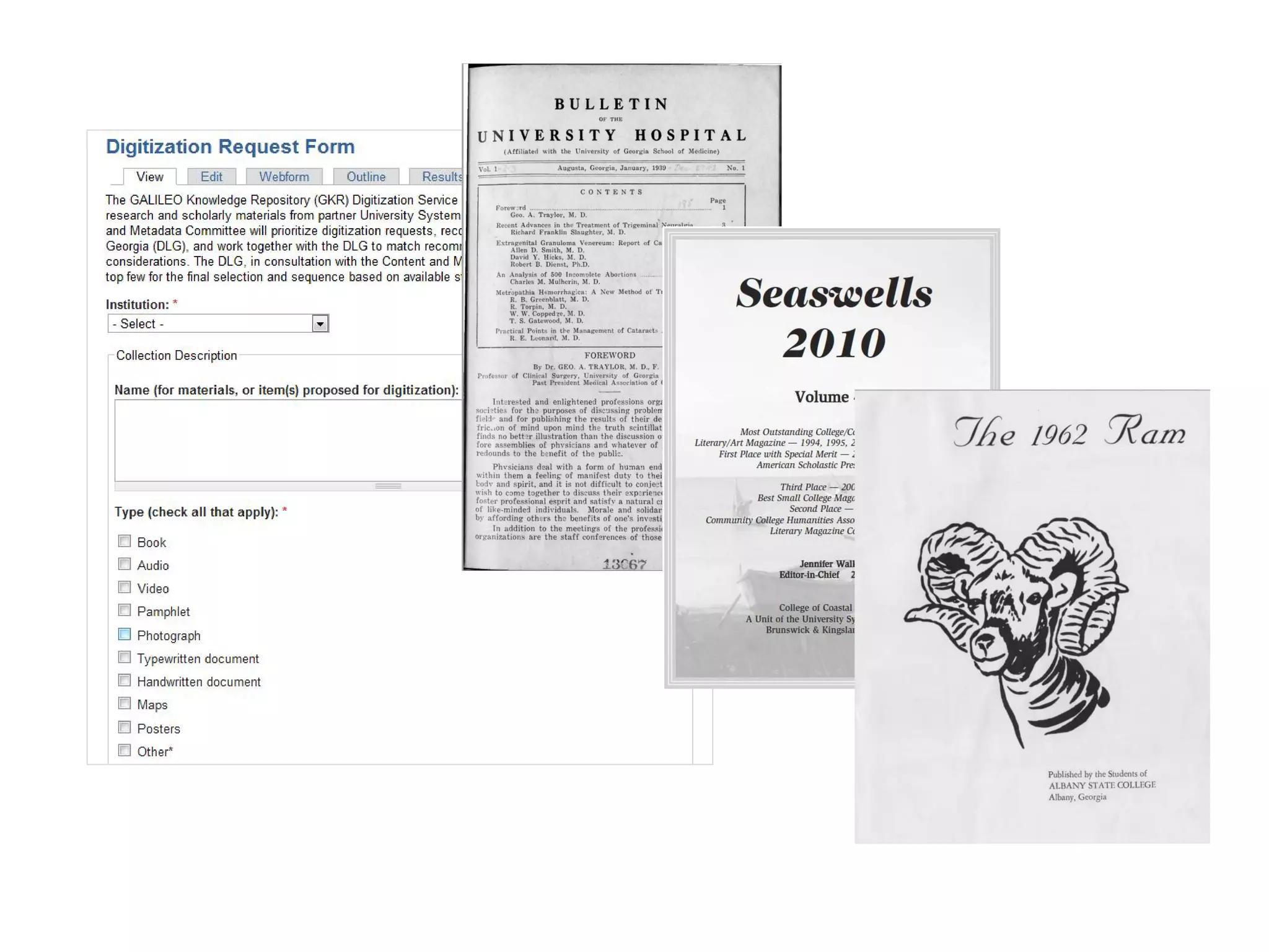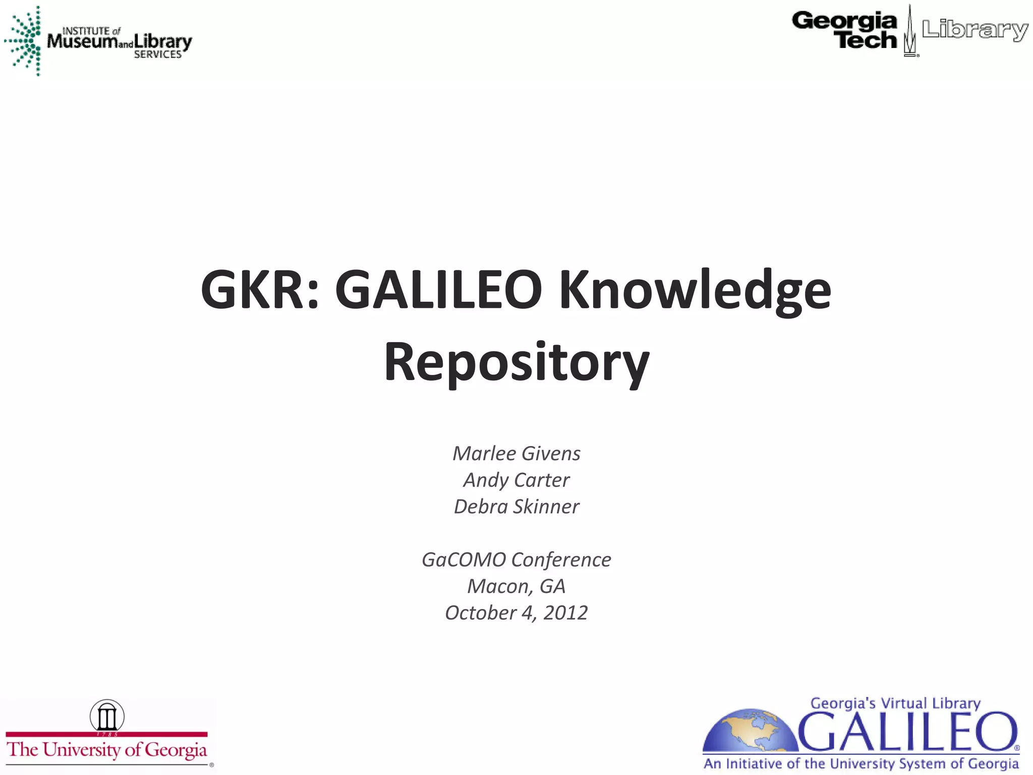 The Galileo Knowledge Repository (GKR) aims to consolidate and enhance digital scholarly output from various institutions within the University System of Georgia, addressing challenges such as disorganization and lack of sustainability. The project includes the development of new institutional repositories, a central metadata repository, and services focusing on digitization and content submission. Future plans involve extending grant services, improving faculty outreach, and transferring hosting services to a vendor.
