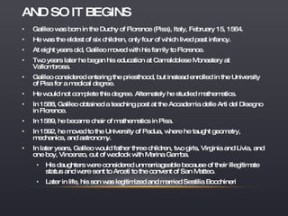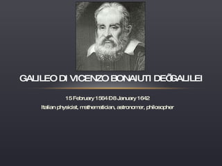 Galileo Galilei was an Italian physicist, mathematician, astronomer, and philosopher born in 1564 in Pisa, Italy. He taught mathematics and astronomy at universities in Pisa and Padua and made several scientific discoveries that contributed to the Scientific Revolution. Galileo supported Copernicus' theory that the Earth and planets revolve around the sun, which he defended despite facing opposition from the Catholic Church. He was tried for heresy by the Inquisition in 1633 and spent the rest of his life under house arrest, where he continued his scientific work until his death in 1642.