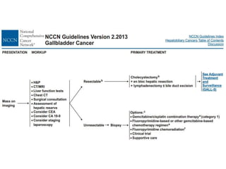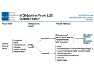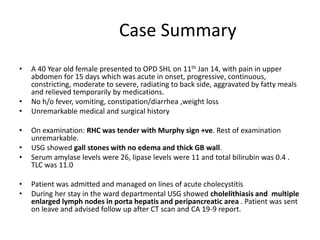 The document details a case summary of a 40-year-old female diagnosed with poorly differentiated adenocarcinoma of the gallbladder, initially presenting with abdominal pain and gallstones, followed by imaging that revealed lymph node involvement. It discusses gallbladder cancer as a malignant disease, its epidemiology, diagnostic workup, potential therapies, and staging based on the TNM classification. The prognosis varies significantly depending on cancer stage, with early-stage detection linked to higher survival rates.