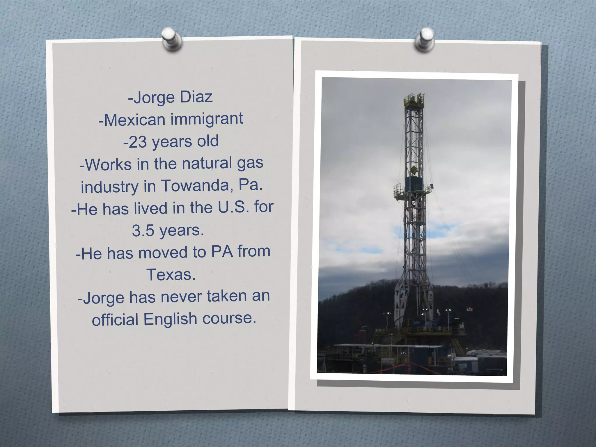 Jorge Diaz is a 23-year-old Mexican immigrant who has lived in the United States for 3.5 years and currently works in the natural gas industry in Pennsylvania. He moved from Texas and has never taken an official English course, instead learning through conversations with bilingual friends and coworkers. The document analyzes differences and similarities between Spanish and English phonology and grammar that impact Jorge's language acquisition and provides examples of errors in his speech. It recommends continued conversation practice and adult ELL courses to help Jorge improve his pronunciation and language skills.
