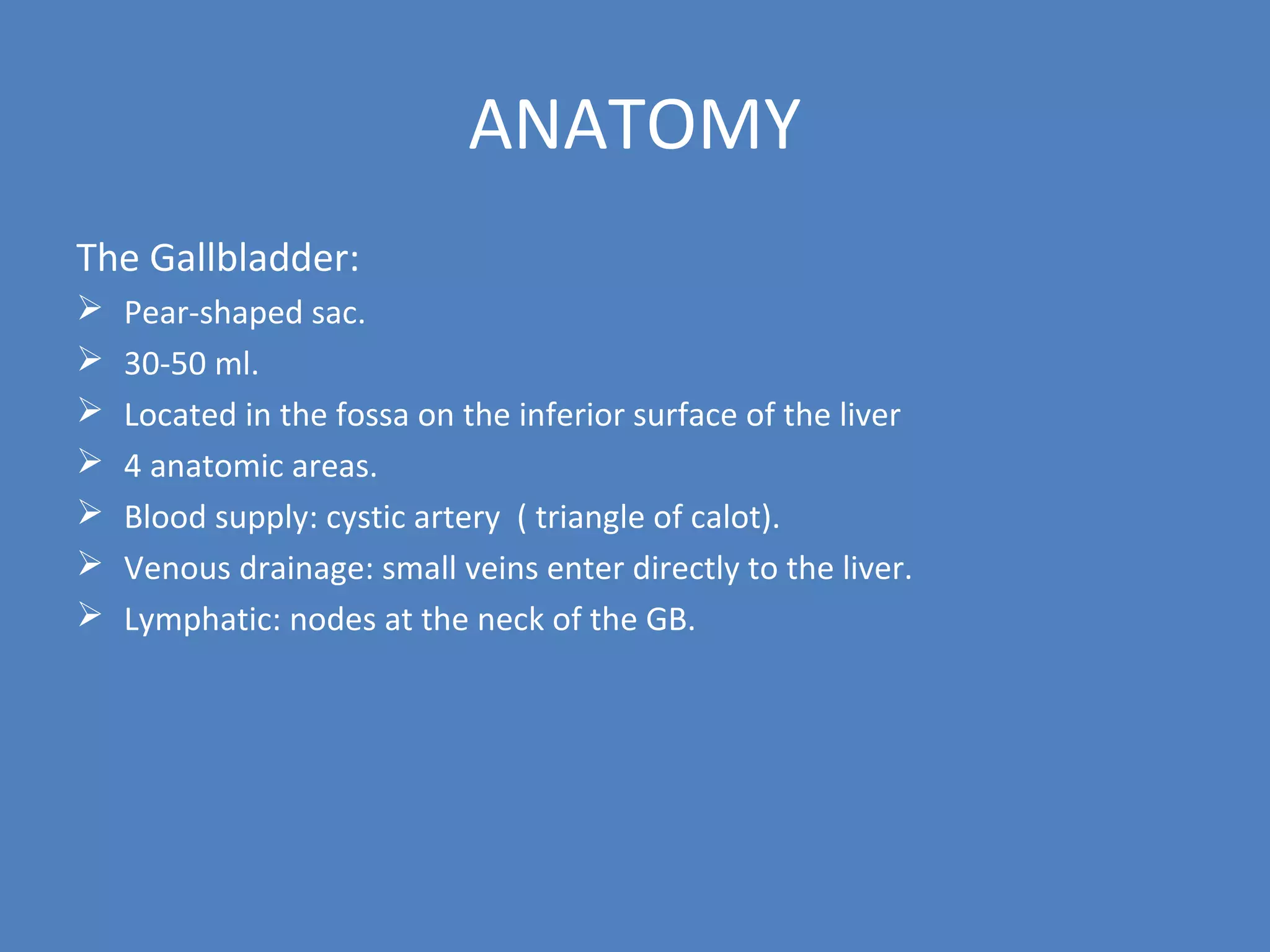 - The gallbladder is a pear-shaped sac located in the liver that stores and concentrates bile. Bile is produced by the liver and aids in fat digestion.