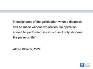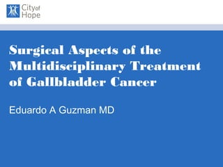 This document summarizes the surgical aspects of treating gallbladder cancer. It discusses the epidemiology, risk factors, staging, diagnosis, and management of gallbladder cancer. For early stage I tumors, surgery including cholecystectomy is usually sufficient. For more advanced stages II-III, aggressive surgery involving liver resection and lymphadenectomy may improve survival rates. Stage IV cancer with metastases has a very poor prognosis with chemotherapy and palliation the only options. An aggressive surgical approach can benefit carefully selected patients without metastatic disease.