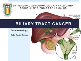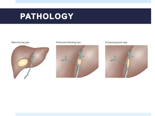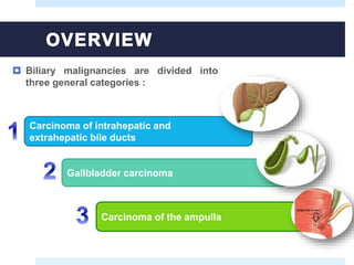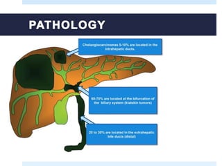 This document discusses biliary tract cancers including cholangiocarcinoma and gallbladder cancer. It provides information on risk factors, pathogenesis, clinical presentation, diagnostic evaluation, staging systems, and treatment options. Biliary tract cancers are generally diagnosed at late stages and have a poor prognosis. Surgical resection remains the only potentially curative treatment option, but palliative approaches are used for non-resectable disease.