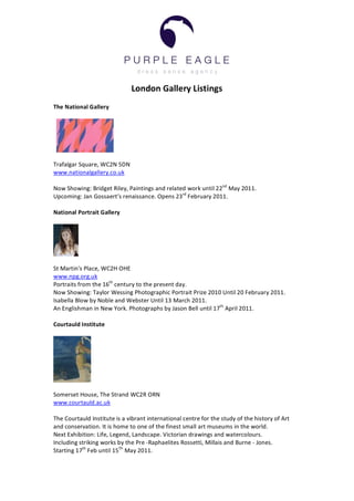This document lists various art galleries in London, detailing current and upcoming exhibitions at prominent institutions such as the National Gallery, Tate Modern, and Saatchi Gallery. It highlights exhibitions featuring renowned artists and art movements, as well as information about gallery locations and websites. The document emphasizes the cultural diversity and richness of London's art scene with a range of styles from historic to contemporary.