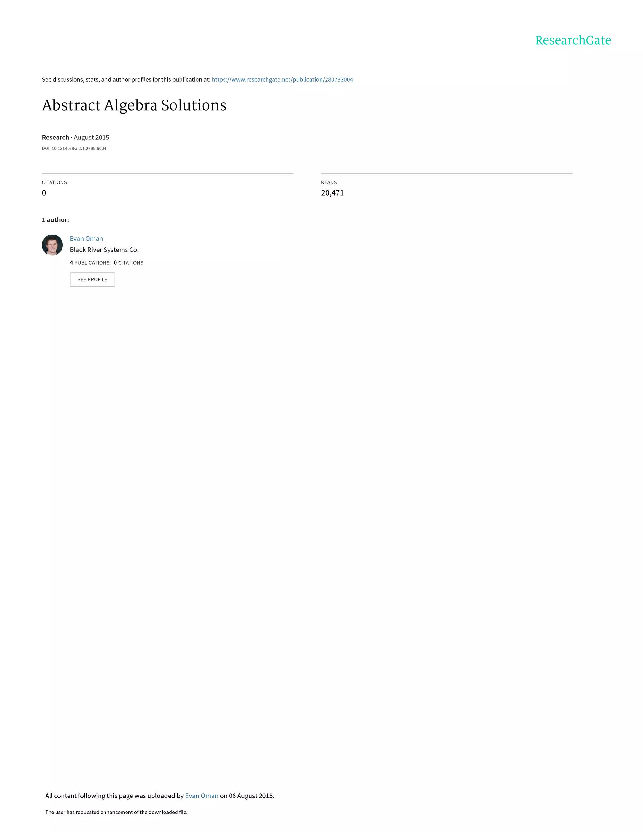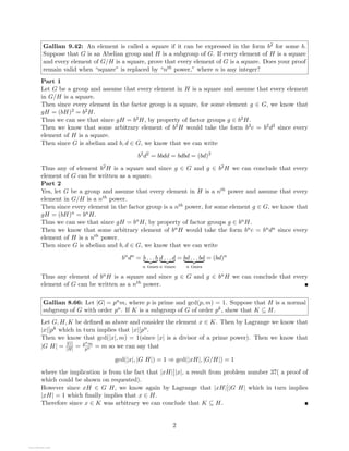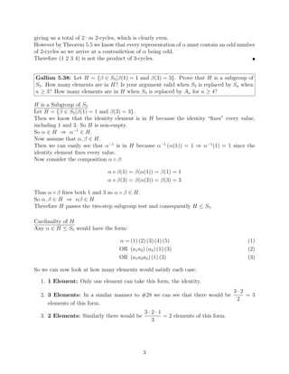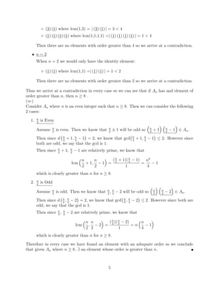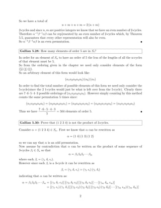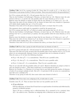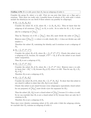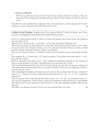 The document provides solutions to homework problems from an abstract algebra class. It contains solutions to 6 problems involving operations and properties of groups, including dihedral groups, subgroups, and elements of specific orders. Key details solved include showing a group with two commuting elements of order 2 must have a subgroup of order 4, determining a subgroup of integers containing certain elements, and proving a dihedral group of order 6 does not have a subgroup of order 4.