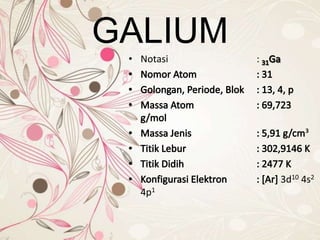 Gallium adalah unsur kimia dengan simbol Ga dan nomor atom 31, yang ditemukan secara spektroskopik dan merupakan logam lembut yang mudah lebur pada suhu rendah. Unsur ini dapat dibuat dari proses pembuatan aluminium dan memiliki berbagai aplikasi seperti dioda pemancar cahaya dan laser. Senyawa penting gallium meliputi galium triklorida dan galium nitrida, yang digunakan dalam teknologi modern.