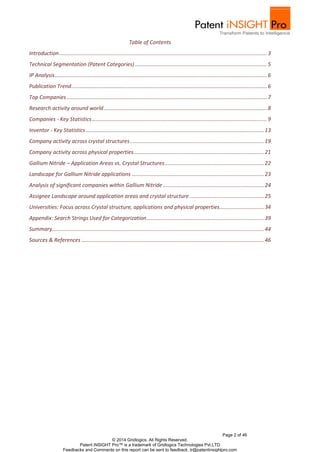 The report provides a detailed analysis of patents related to gallium nitride (GaN) technology published in the US from 2004 to 2014, focusing on trends, key companies, and application areas. GaN is recognized for its unique properties suitable for high-power, high-frequency, and optoelectronic applications. The findings emphasize the growing innovation surrounding GaN technology and highlight top patents and assignees, alongside trends in research and development.