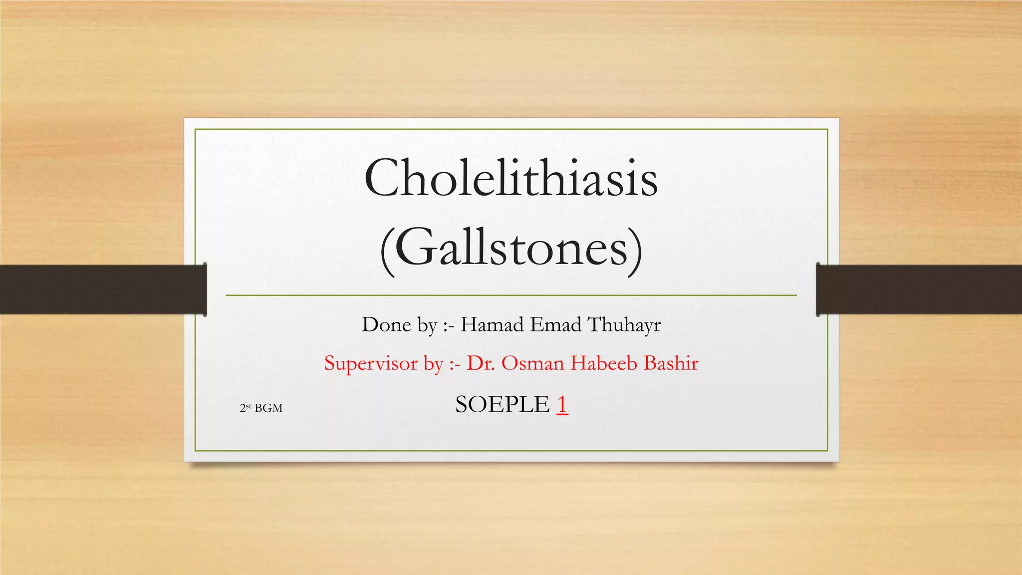 Mr. B, a middle-aged man, experienced abdominal pain after eating fatty foods that radiated to his back and caused nausea. An examination and ultrasound were planned to evaluate for possible biliary diseases like cholelithiasis. Cholelithiasis, or gallstones, occur when bile contains too much cholesterol and not enough bile salts, causing stones to form in the gallbladder or ducts. Gallstones are often diagnosed by ultrasound and may be treated by laparoscopic cholecystectomy to remove the gallbladder.