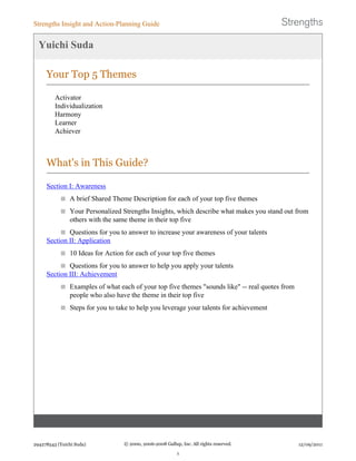 This document provides a StrengthsFinder report for an individual named Yuichi Suda. It outlines their top 5 themes: Activator, Individualization, Harmony, Learner, and Achiever. For each theme, it provides a shared description, personalized insights specific to Yuichi Suda, and questions to increase self-awareness and help apply their talents. The report is intended to help Yuichi Suda understand their strengths and leverage them for achievement.