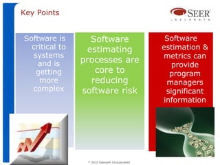 This document summarizes key points from a presentation on software estimating and its impact on successful missions. It discusses how software is a critical and increasingly complex component of systems that is prone to failures and costly overruns if not estimated properly. Estimation processes and using metrics can help program managers reduce risks. The document provides examples of software failures and their high costs, and emphasizes that software estimates should be treated as high risk and reviewed at each program review. It also outlines best practices for software estimation like using a 10 step process and accounting for size, complexity, productivity and risks.