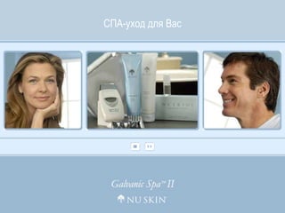 Документ описывает систему galvanic spa ii, основанную на использовании гальванических токов для улучшения состояния кожи и волос. Устройство применяет специальные гели и сменные насадки для достижения эффектов омоложения, восстановления и лечения различных кожных проблем. Кроме того, обсуждаются клинические результаты использования системы, подтверждающие ее эффективность в домашних условиях.