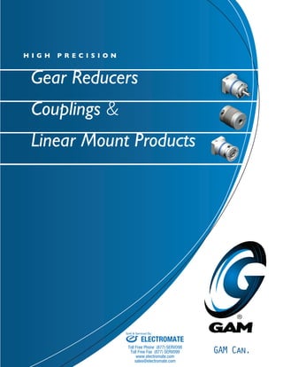 This document provides information on gear reducers and related products from GAM. It includes summaries of GAM's highest performance inline planetary gear reducer series, the SPH series, which features helical gears for high torque and precision. Specifications are provided for the various SPH model configurations, which can be customized to meet application needs. The document emphasizes the flexibility, modifications, performance and quality that make the SPH series superior to competitors' products.
