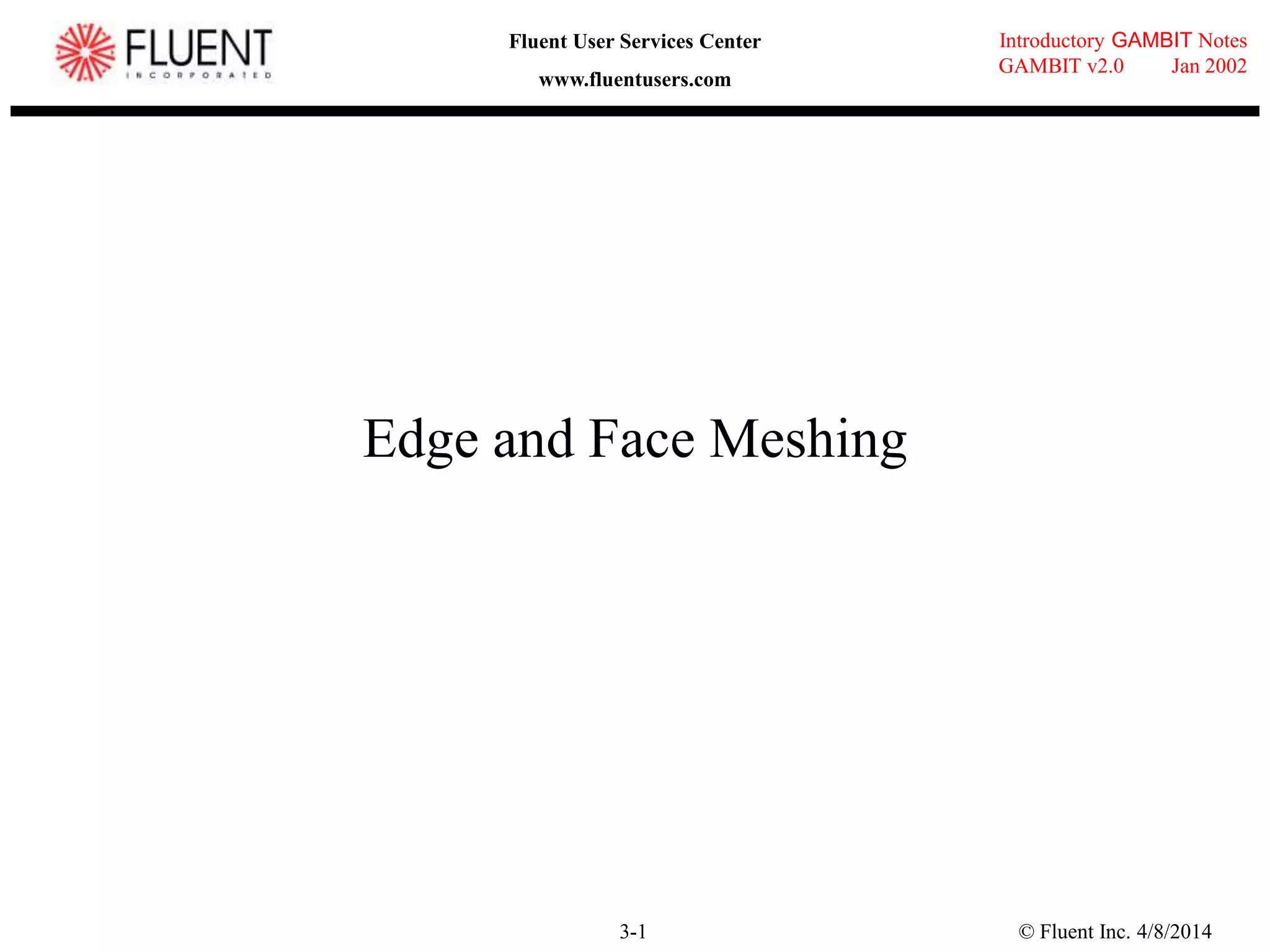 This document provides an overview of meshing tools in GAMBIT including edge meshing, face meshing, examining mesh quality, assigning boundary conditions, and using linear and quadratic elements. Key topics covered include controlling mesh density through grading and spacing, various face meshing schemes for quads and tris, assessing mesh quality using equiangle skew, and assigning boundary and material types.