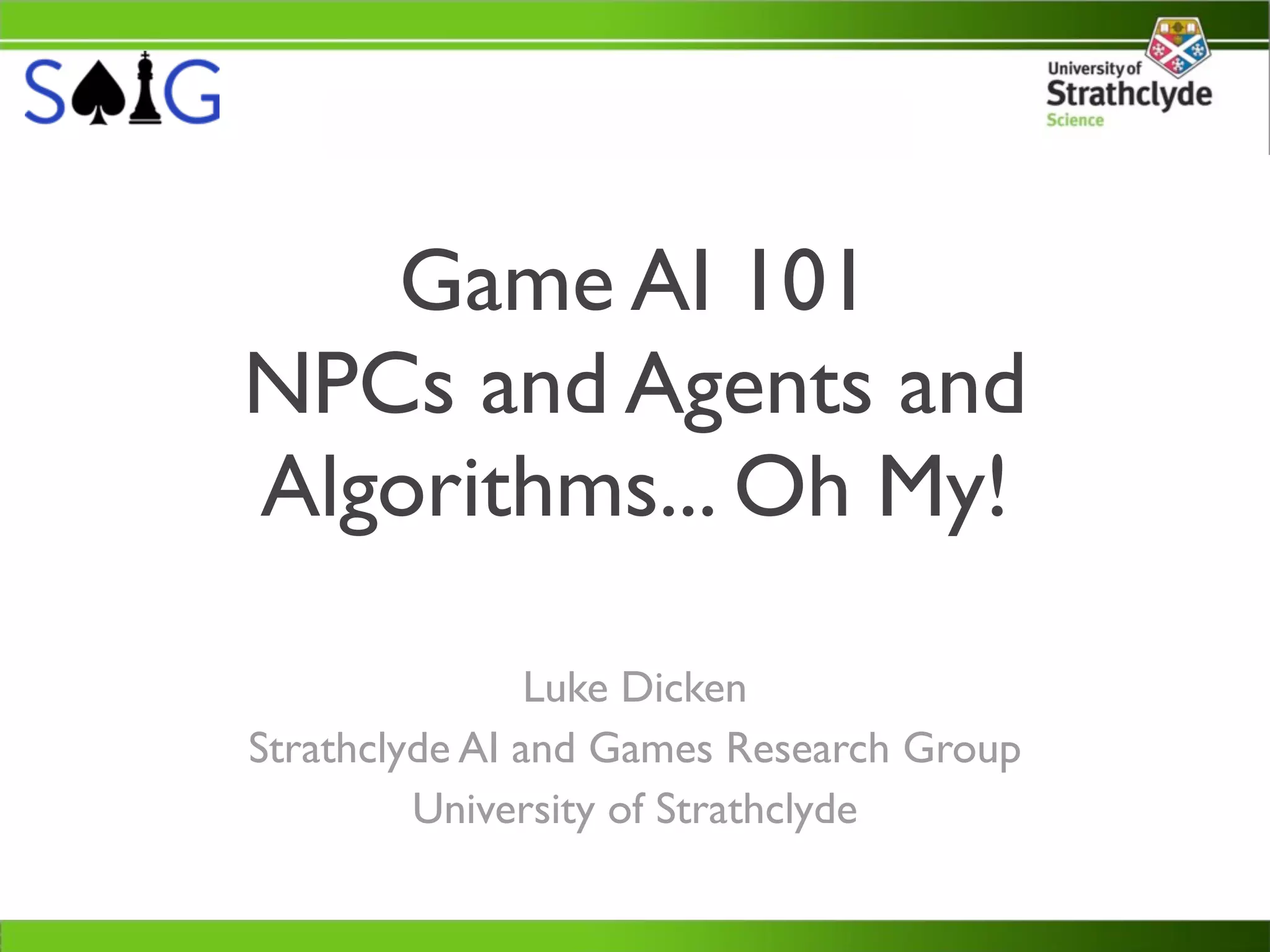 The document, presented by Luke Dicken from the University of Strathclyde, provides an introductory overview of game AI and the techniques used to populate game worlds with non-player characters (NPCs). It distinguishes between 'pure' AI, which focuses on optimal real-world problem-solving, and game AI, which prioritizes creating immersive and believable character simulations for enhancing player experience. Key concepts discussed include decision-making processes, agent-based systems, and the representation of intelligence within NPCs.