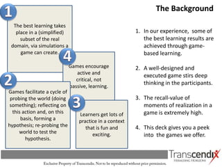 Transcendix offers games-based learning interventions and expertise in designing customized games. Some key benefits of games-based learning highlighted include active participation, critical thinking, high recall value, and a fun context. The document provides an overview of sample games focused on areas like culture, teamwork, leadership, and strategy. It also lists past client organizations and details the process for designing a customized game including timelines and pricing discussed on a case-by-case basis.