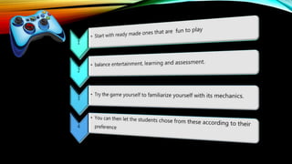 This document discusses game-based learning and provides guidance for educators on adopting it. It defines game-based learning as using video games to support teaching and learning, with defined learning outcomes. It notes the growing market for educational games and cites research that game-based learning motivates students and enhances assessment through instant feedback. The document recommends personalized professional development and using available school resources. It provides examples of educational games for subjects like English, medicine, civics, and math. Overall, the document promotes game-based learning and offers best practices for integrating games into instruction.