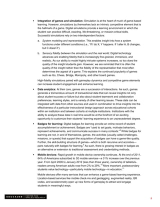 This document provides an overview of game-based learning and outlines strategies for developing an institutional approach. It discusses trends driving adoption such as student expectations, data analytics, badges, and mobile devices. Challenges include one-off games, integrating learning objectives, accessibility, and cultural barriers. The document proposes an institutional framework including commitment, a center of excellence, grants, maintaining academic quality, faculty readiness support, and assessment tracking.