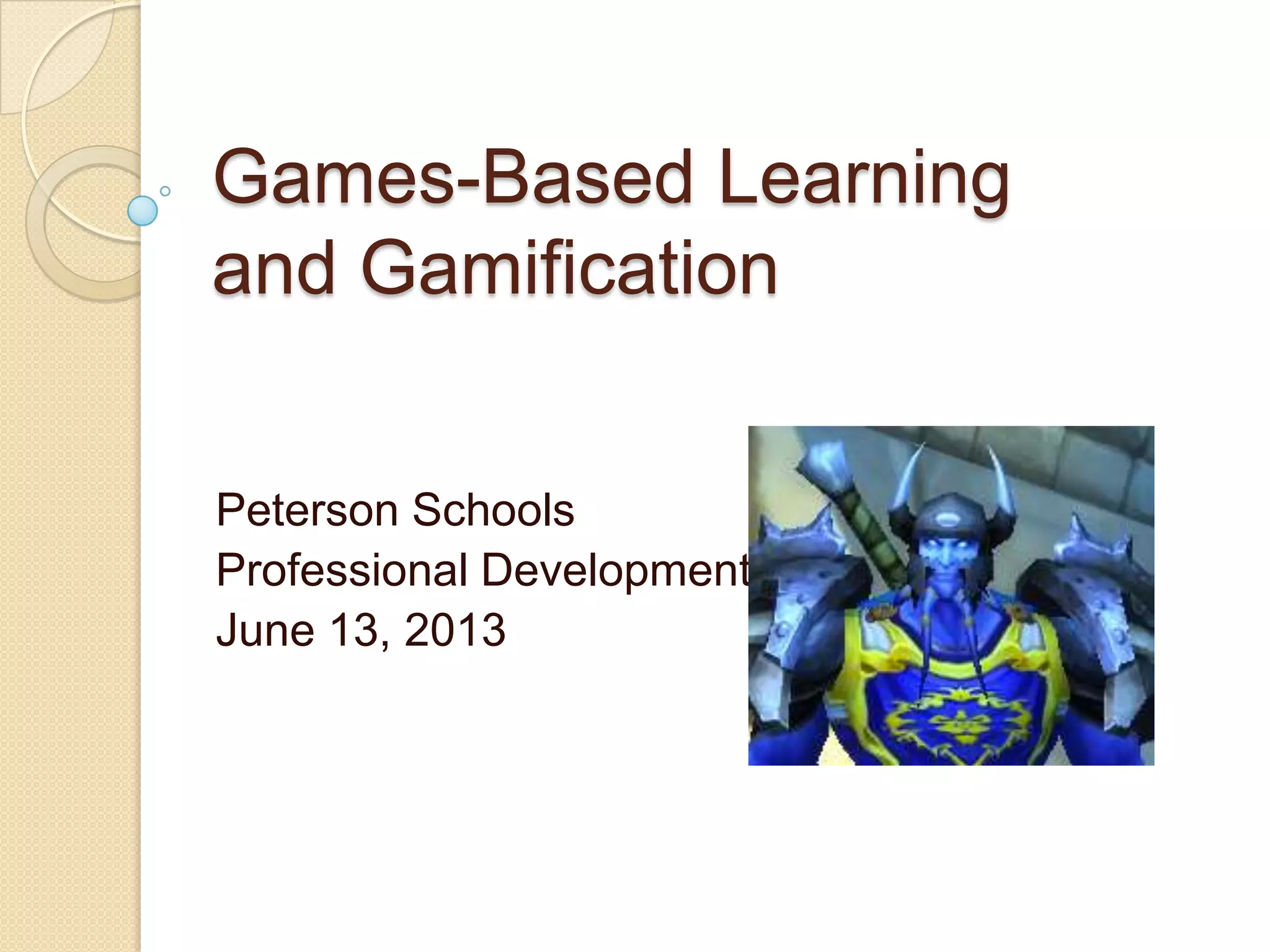 This document discusses games-based learning and gamification in education. It defines games-based learning as using games designed for education or repurposing existing games for educational goals. Gamification involves adding game elements and mechanics to non-game contexts to increase engagement. The document contrasts the two, providing examples of each. It outlines advantages like improved engagement and learning skills, and disadvantages like technical issues or objectionable content. Examples of educational games are presented and the document encourages using games and gamification in classes to supplement lessons.