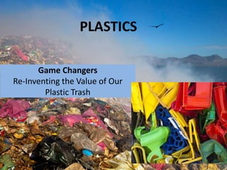 This document discusses various challenges and solutions related to plastic waste. It describes how plastic waste has become a global problem impacting human health, marine life, and the environment. It then profiles multiple companies developing innovative approaches to tackle the issue of plastic waste, such as recycling plastic from the Great Pacific Garbage Patch, converting complex waste streams into high quality recycled plastic, and using gasification technology to reduce plastic waste and produce oil and fuel. These companies face challenges in scaling their solutions but also opportunities in partnering with other organizations.