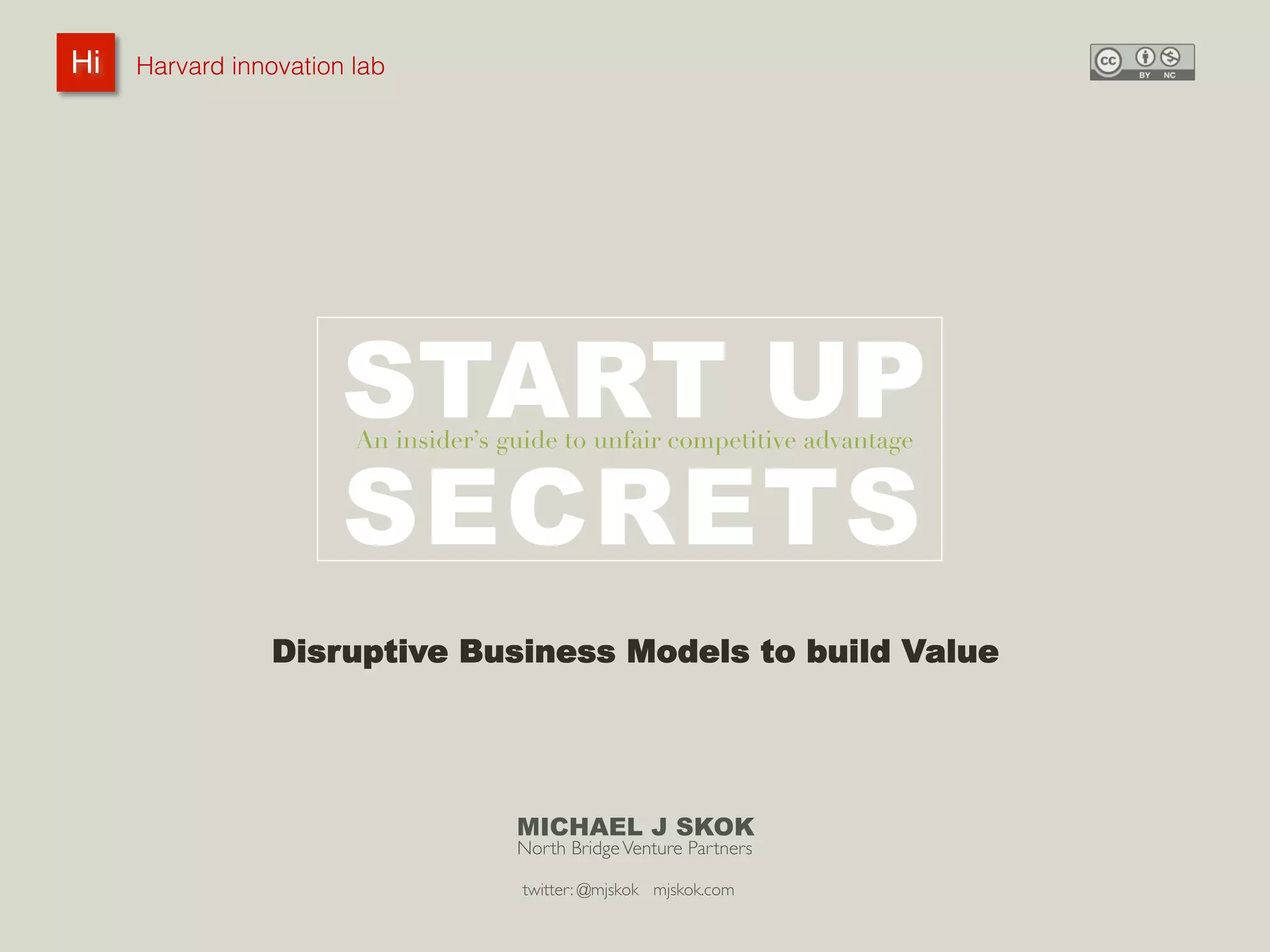 The document outlines insights from Michael J. Skok on creating disruptive business models in startups, focusing on identifying core value, leveraging innovation, and designing for competitive advantage. It emphasizes the importance of partnering strategically and utilizing co-creation and open source as tools for business growth. Various examples are provided, illustrating successful business model transformations and the strategic use of multipliers and levers to enhance value delivery.