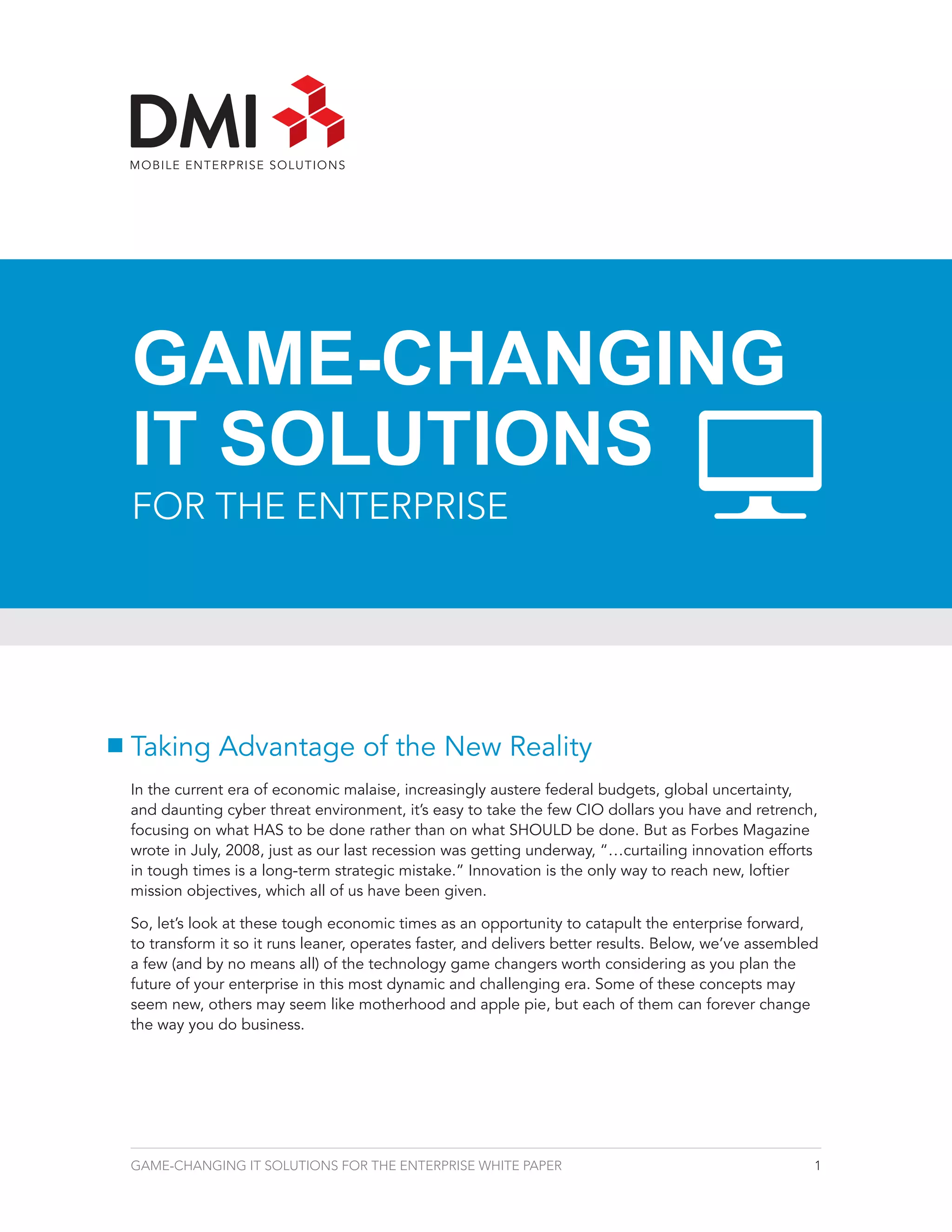 The document discusses several game-changing IT solutions for enterprises, including the Extended Enterprise Operations Center (EEOC) which integrates network, mobility, security, and cloud monitoring; Enterprise Performance Management tools for automating business processes and providing dashboards; a secure Enterprise AppStore for mobile applications; adopting Trusted Computing technologies to secure devices on networks; client-side virtualization for security and efficiency; and how these solutions can help enterprises innovate and transform even during challenging economic times. The document was published by IT solutions provider DMI to promote their services and solutions.