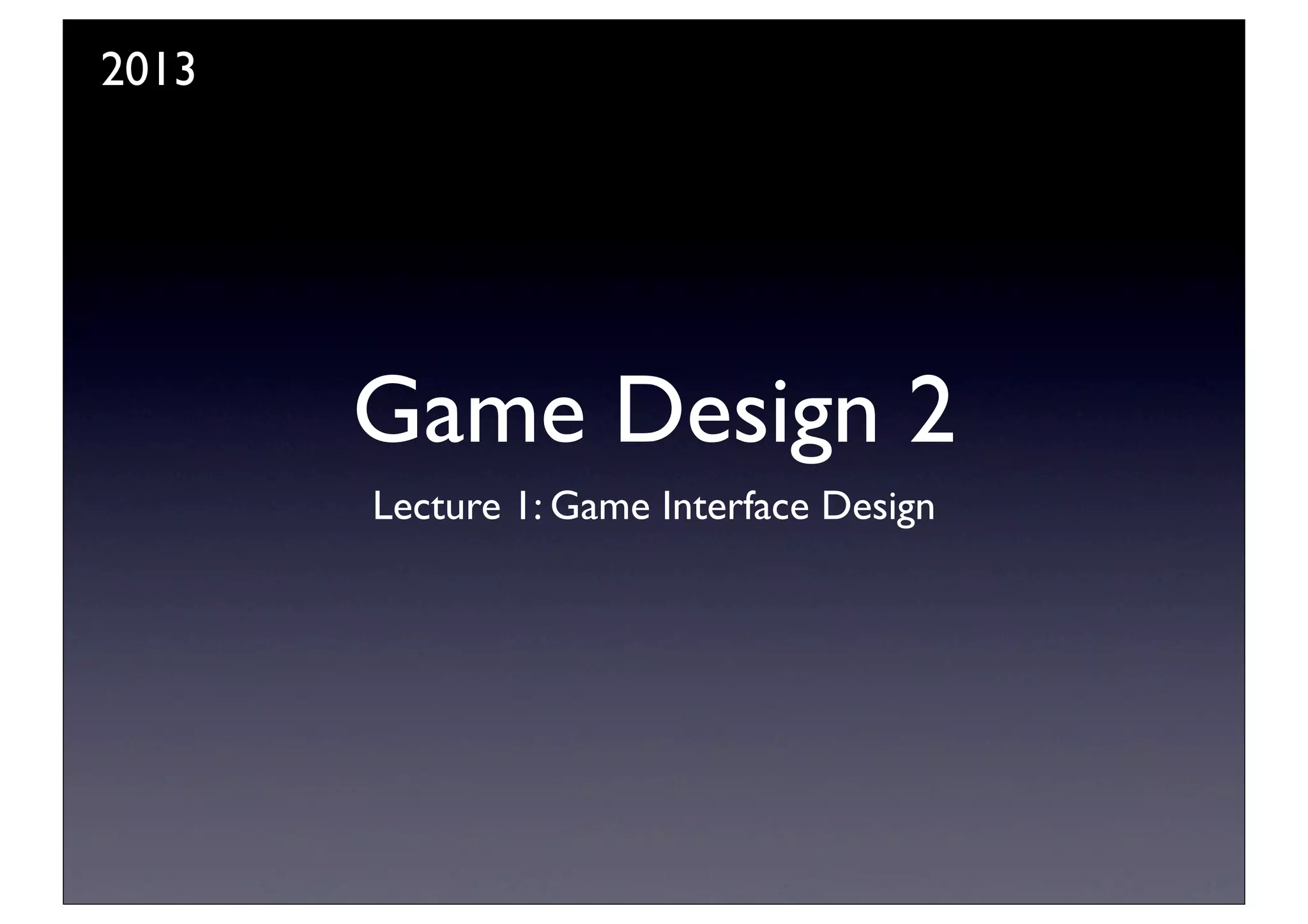 The document outlines the structure and expectations for a Game Interface Design course in 2013, which includes 20 credits divided into 50% coursework and 50% exam. It highlights the use of Adobe Flash CS5.5 for labs, covers topics like menu design, HUDs, and interaction design, and encourages students to engage in tutorials and prototyping. Contact information for the instructor and resources are also provided.