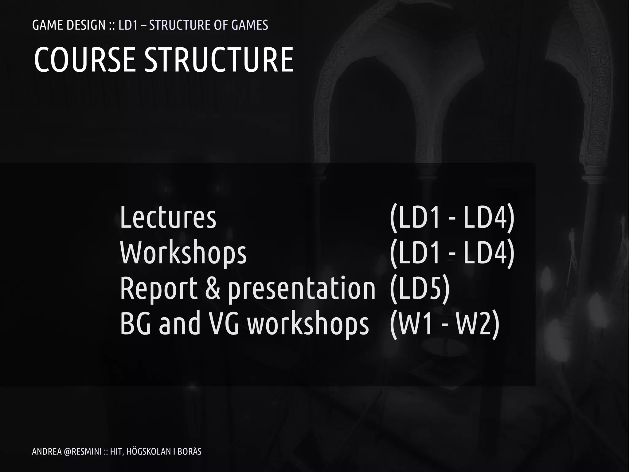 The document outlines the structure of a game design course, focusing on lectures, workshops, group work, and project discussions. It discusses the formal and dramatic elements of games, the characteristics that define a game, and the importance of player engagement and conflict. It emphasizes that a game is a dynamic system structured by formal elements and enhanced by dramatic elements, ultimately resolving uncertainties through outcomes.
