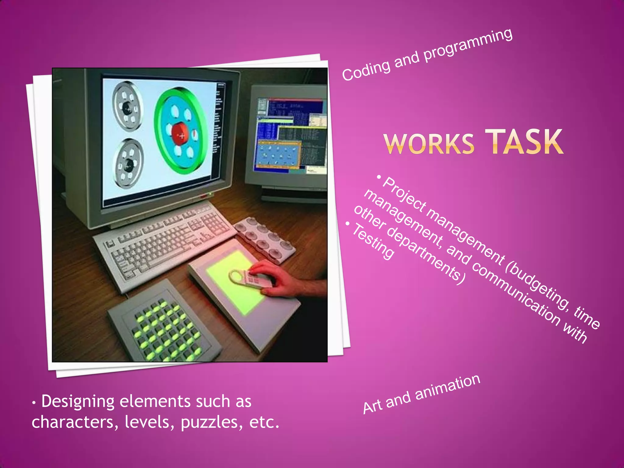 The document discusses the key skills and requirements for a career in computer game design. It notes that artistic abilities are important for creating graphics and animations for complex game characters and environments. Teamwork is also essential, as game design requires collaborating with others to meet goals and deadlines. Technical skills are necessary as well, as game design involves writing code and using software. A college degree in computer science or programming is typically required. Passion for video games is important, as the work involves long hours and dedication. Salaries start at around $46,000 and increase with experience up to $70,000 after 6 years. The career seems interesting to the author as it allows creating games while earning a good income.