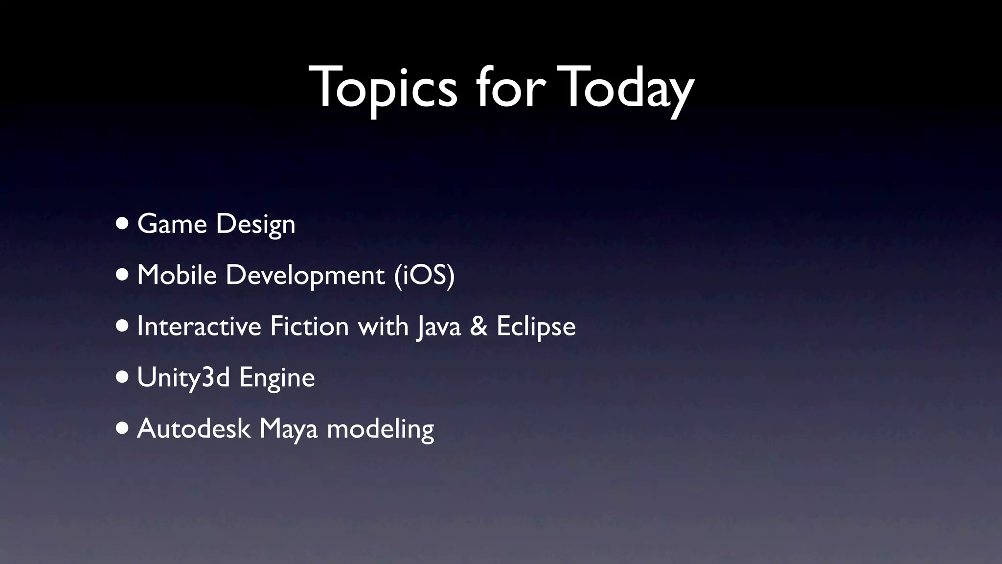 The document discusses various topics related to video game development including game design, mobile development for iOS, interactive fiction using Java and Eclipse, the Unity3D game engine, and 3D modeling with Autodesk Maya. It provides tips for each topic such as making games fun within the first 3 minutes and designing for mobile gamers who want brief play sessions. It also demonstrates the GodWars game and promotes Unity3D as a powerful cross-platform engine and Autodesk Maya as the top 3D modeling software used in major games.