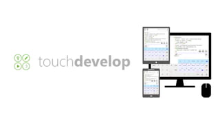 This document discusses using TouchDevelop to build mobile games and apps. It introduces TouchDevelop and some important coding concepts like objects, functions, parameters, variables, and conditional statements. The agenda includes a TouchDevelop tour and lessons on these concepts, as well as loops and using "on every frame" to continuously check conditions. Resources are provided for teaching TouchDevelop, including pre-built games and tutorials that can be customized.