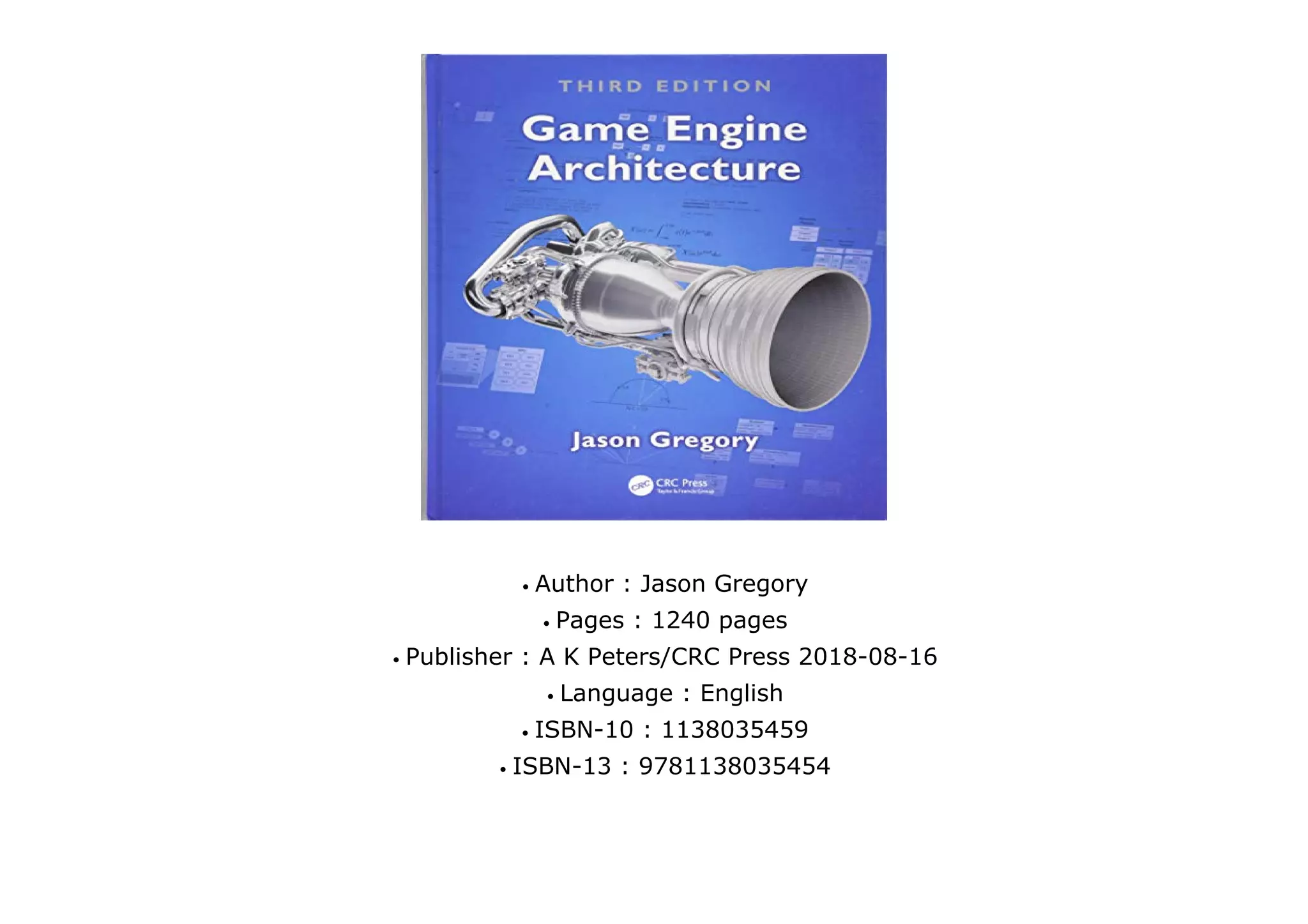 This book titled "Game Engine Architecture, Third Edition" is a 1240 page book written by Jason Gregory about building game engines. It was published in 2018 by A K Peters/CRC Press. The book provides information to help readers develop their own game engines, covering topics such as rendering engines, scripting systems, physics simulation, and audio.