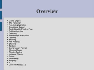 The document provides an overview of the key components and workflow of a 3D game engine rendering pipeline. It discusses topics like the renderer, coordinate systems, culling techniques, and the stages of the graphics processing pipeline including geometry processing, rasterization, lighting and shading. It also compares the differences between a game engine and the actual game content and explains some of the core functionality typically provided by a game engine.