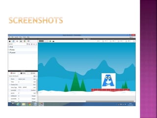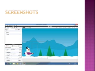 This document discusses the development of a 2D platform game for children up to 5 years old that incorporates a physics engine. The game aims to teach basic concepts of physics like friction and collisions through play, while also imparting early education on alphabets. It was created using GameSalad and an integrated 2D physics engine to govern environmental objects and player movement. The game went through various testing stages including functionality, compatibility, beta and regression testing to ensure quality.