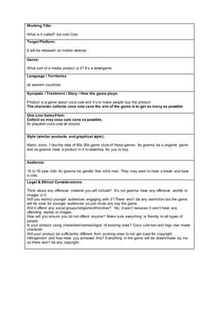 This document provides a proposal for an advergame called "Ice Cold Cola" that would promote Coca-Cola on mobile devices. The game would have the player collect Coca-Cola cans to get the highest score possible. It is targeted towards 16-19 year olds and will be inspired by retro 8-bit and 16-bit game styles from the 1980s and 1990s like Mario and Sonic. Special care is taken to ensure the game does not include any offensive or inappropriate content that could offend players or social groups and risk legal issues.