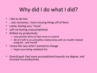 This document describes how the author gamified their graduate school experience to increase productivity and feelings of accomplishment. Key aspects included: